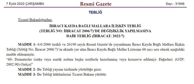 Resmi Gazete'de yer alan tebliğe göre, "İhracı Kayda Bağlı Mallar Listesine 60'ıncı sıra olarak domatesler, (sirke veya asetik asitten başka usullerle hazırlanmış veya konserve edilmiş), (salça) eklenmiştir." ifadesi yer aldı.