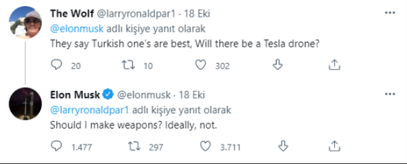 Amerikalı iş insanı Elon Musk, "Türk drone'ları için en iyisi diyorlar, Tesla drone üretmeyi düşünüyor mu?" sorusuna, silah üretmeyi düşünmediğini belirterek, "Silah yapmalı mıyım? İdeal olarak, hayır" yanıtında bulundu.