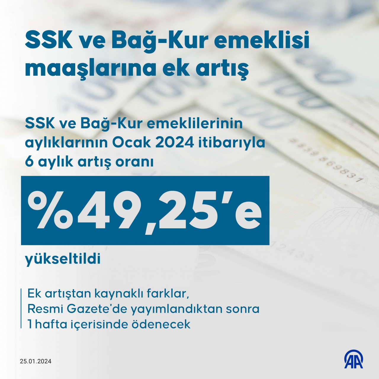 Böylece SSK ve Bağkur emekli maaş zammını, memur emeklisiyle eşitleyen bu önerge ile oran yüzde 49,25’e çekilmiş oldu. Bugün tamamlanarak kanunlaşacak yasal düzenleme, Cumhurbaşkanı Recep Tayyip Erdoğan’ın onayından hemen sonra Resmi Gazete’de yayınlanarak yürürlüğe girecek.