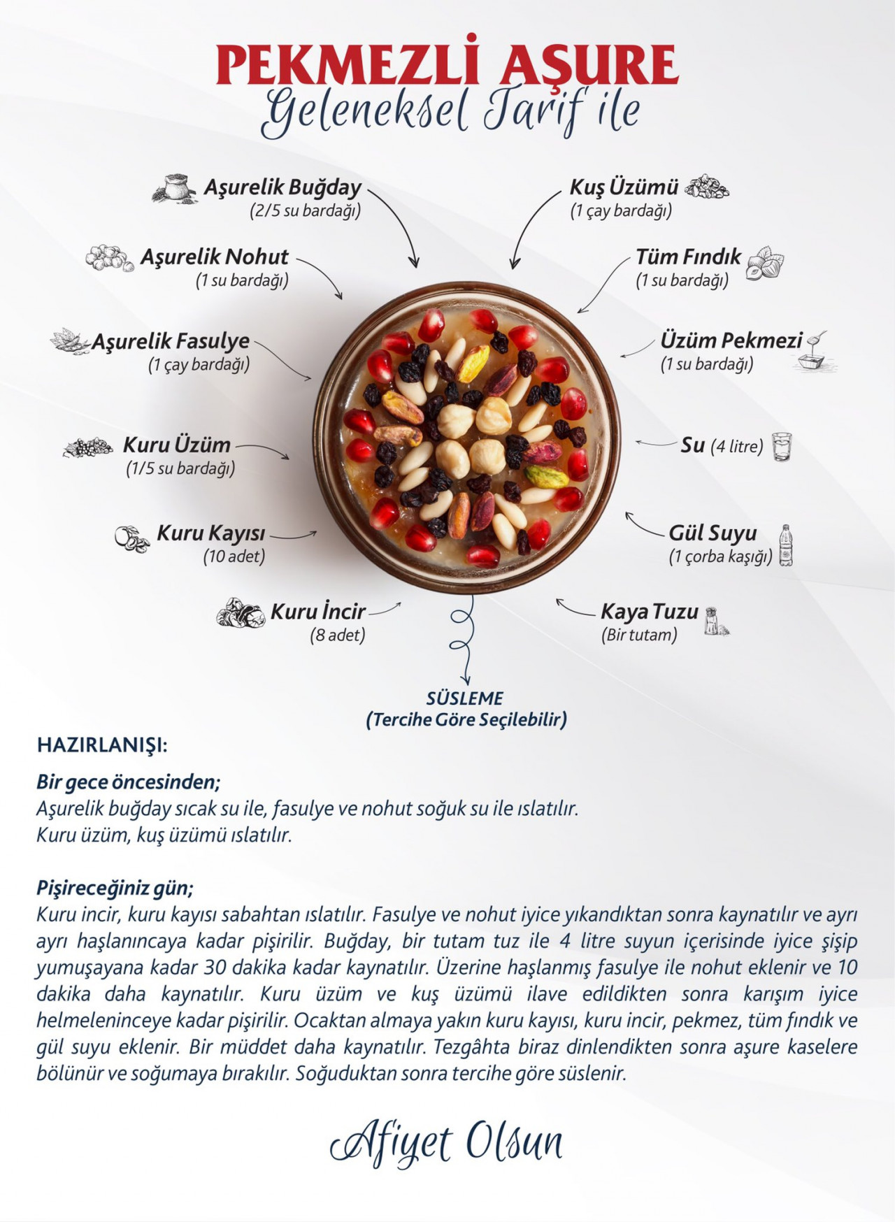 Tarifini paylaştığım aşure, herkesin çok iyi bildiği, yüzyıllardır mutfaklarımızda pişirilen geleneksel bir reçete. Aşure paylaşmaktır, komşularımıza ulaştırmayı unutmayalım. Yurdumuzun dört bir yanından sofralarımıza ulaşan yerel ürünlerle hazırladığım aşurede şeker kullanmadık. Onun yerine kuru meyveler ve biraz da üzüm pekmeziyle tatlandırdık. Bu lezzetli, sağlıklı tarifin, sofralarınıza neşe getirmesini diliyorum."