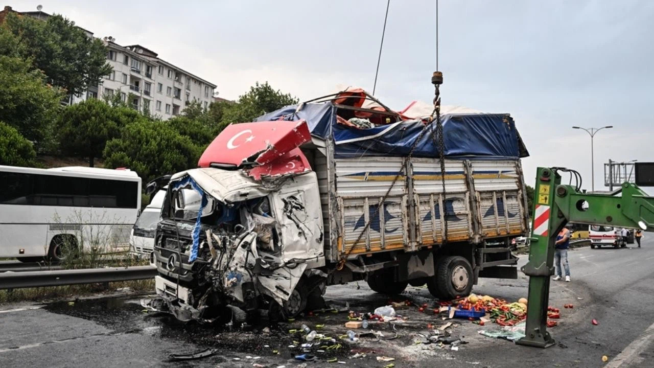Bahçeşehir istikametinde seyreden Muharrem Kuru idaresindeki 34 YJ 9816 plakalı sebze yüklü kamyon, bilinmeyen nedenle bariyerleri aştıktan sonra diğer yöne geçerek devrildi.