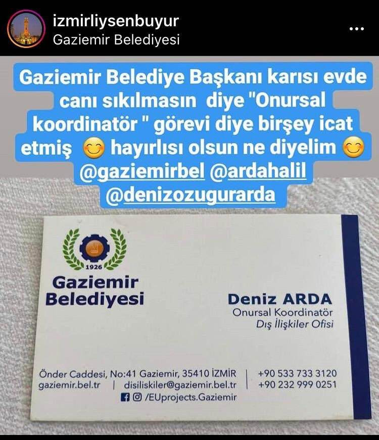 Kendisi için Gaziemir Belediyesi ismi ve logosu bulunan bir kartvizit bastıran Deniz Arda’nın bu kartvizitte unvan olarak ise ‘Onursal Koordinatör - Dış İlişkiler Ofisi’ni kullandığı ortaya çıktı.