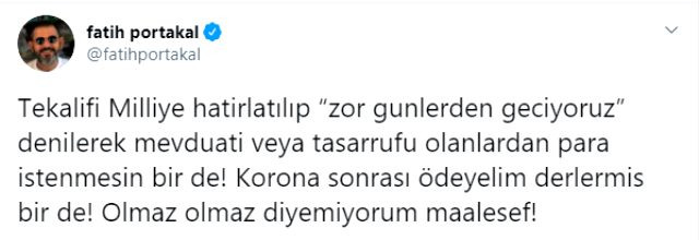 Sabah gazetesinden Fatih Ulaş'ın haberine göre; Fatih Portakal'ın sosyal medya paylaşım sitesi Twitter'dan Tekalif-i Milliye'ye atıfta bulunarak "Zor günlerden geçiyoruz. Mevduat veya tasarrufu olanlardan para istenmesin bir de! Olmaz olmaz diyemiyorum maalesef" şeklinde yaptığı paylaşım nedeniyle BDDK (Bankacılık Düzenleme ve Denetleme Kurumu) suç duyurusunda bulunmuştu.
