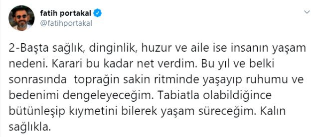 Fatih Portakal, şimdilik televizyon ekranlarına veda etse de bu ayrılık için kesin konuşmadı. Twitter hesabından açıklama yapan başarılı sunucu gelecek yıllar için toprakla uğraşma ihtimali için "belki" dedi ve şunları yazdı "Başta sağlık, dinginlik, huzur ve aile ise insanın yaşam nedeni. Kararı bu kadar net verdim. Bu yıl ve belki sonrasında toprağın sakin ritminde yaşayıp ruhumu ve bedenimi dengeleyeceğim. Tabiatla olabildiğince bütünleşip kıymetini bilerek yaşam süreceğim. Kalın sağlıkla"