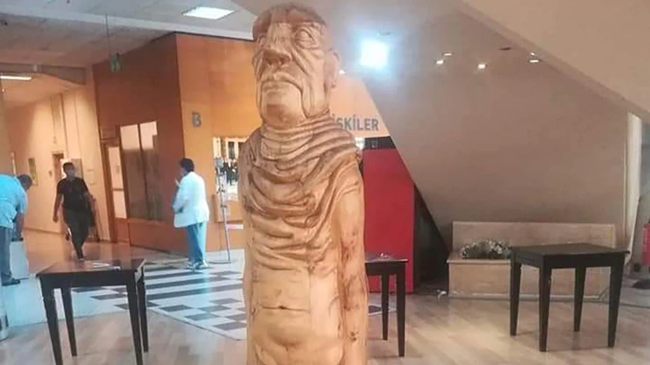 2015 yılında ahşaptan yapıldığı belirtilen heykel, Kadıköy Belediyesi ana binasının giriş kısmında sergileniyor.