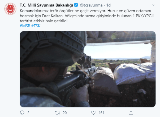 MSB açıklamasında, "Komandolarımız terör örgütlerine geçit vermiyor. Huzur ve güven ortamını bozmak için Fırat Kalkanı bölgesinde sızma girişiminde bulunan 1 PKK/YPG'li terörist etkisiz hale getirildi" denildi.