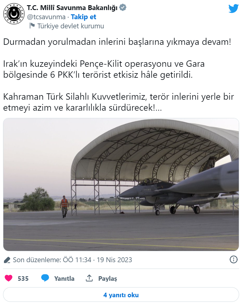 Milli Savunma Bakanlığı'nın resmi Twitter hesabından yapılan açıklamada, "Durmadan yorulmadan inlerini başlarına yıkmaya devam. Irak’ın kuzeyindeki Gara bölgesinde 6 PKK’lı terörist etkisiz hale getirildi. Kahraman Türk Silahlı Kuvvetlerimiz, terör inlerini yerle bir etmeyi azim ve kararlılıkla sürdürecek" ifadelerinde bulunuldu.