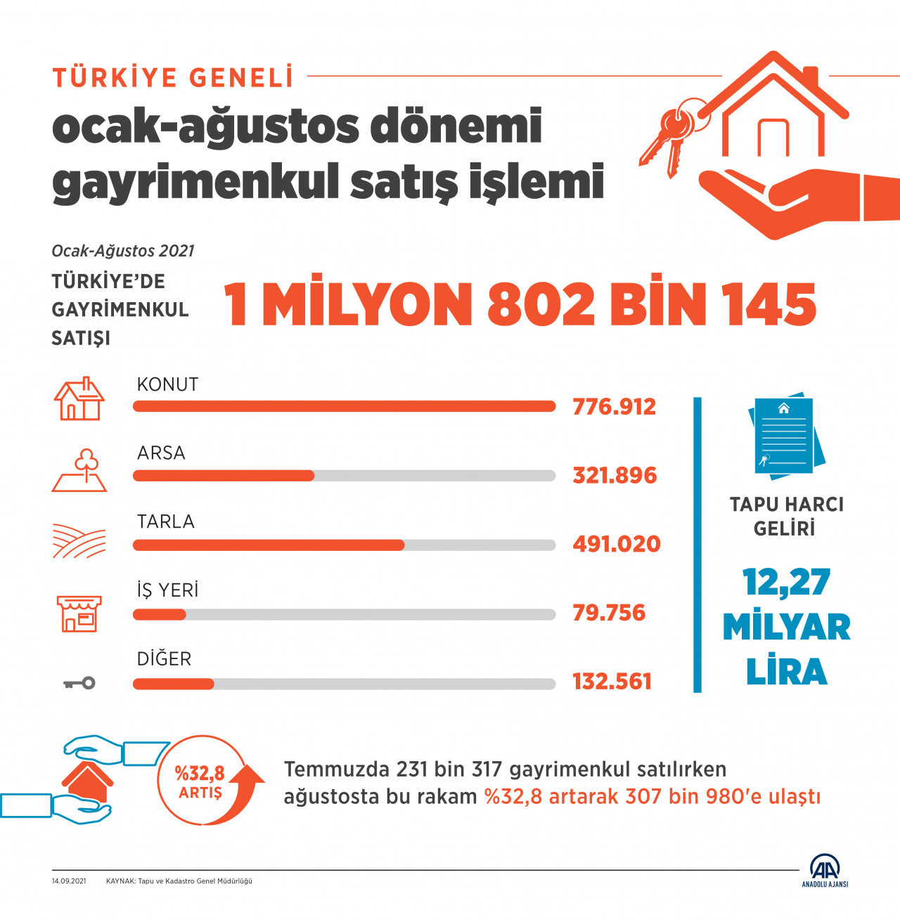 Ocak- Ağustos 2021 döneminin baz alındığı çalışmada 776 bin 912 konut, 321 bin 896 arsa, 491 bin 20 tarla, 79 bin 756 iş yeri ve 132 bin 561 diğer satışlar olmak üzere toplam 1 milyon 802 bin 145 gayrimenkul el değiştirdi.