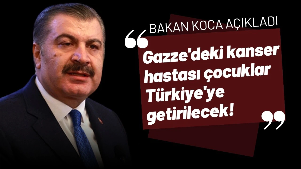 Sağlık Bakanı Fahrettin Koca, dün İsrail Sağlık Bakanı ile görüştüğünü, çocuklar başta olmak üzere hastaların Mısır'a taşınması ve oradan Türkiye'ye getirilerek tedavi edilmesi için hazır olduklarını ifade ettiğini belirterek, "En yakın sürede kanser hastası çocukları Türkiye'ye getirmeye başlayacağız." dedi.