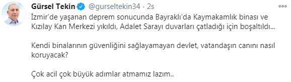 Tekin, sosyal paylaşım sitesi Twitter'daki hesabından, "İzmir'de yaşanan deprem sonucunda Bayraklı'da Kaymakamlık binası ve Kızılay Kan Merkezi yıkıldı, Adalet Sarayı duvarları çatladığı için boşaltıldı... Kendi binalarının güvenliğini sağlayamayan devlet, vatandaşın canını nasıl koruyacak?" iddialarında bulunarak "Çok acil çok büyük adımlar atmamız lazım.." dedi.