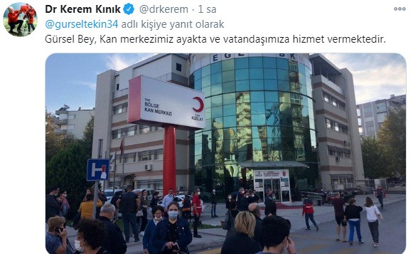 Gürsel Tekin'e cevap, Kızılay Genel Başkanı Kerem Kınık'tan geldi. Kınık, Twitter hesabından yaptığı açıklamada, "Gürsel Bey, Kan merkezimiz ayakta ve vatandaşımıza hizmet vermektedir." ifadelerini kullanarak Kan merkezinin fotoğrafını paylaştı.
