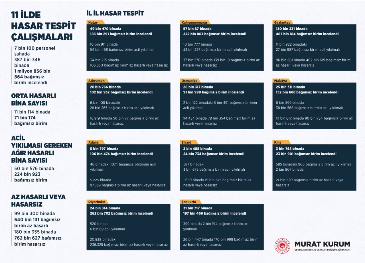 Hasar tespit çalışmalarıyla ilgili resmî sosyal medya hesabından paylaşımda bulunan Bakan Kurum, “Hasar tespit çalışmalarımız 7 bin 100 personelle sürüyor. 387 bin 346 bina incelendi. Şu ana kadarki tespitlerimize göre; acil yıkılması gereken 50 bin 576 bina var. 279 bina 655 bina az hasarlı veya hasarsız. Acil yıkılması gerekenleri hızla yıkıp güvenli konutlar inşa edeceğiz!” ifadelerini kullandı.