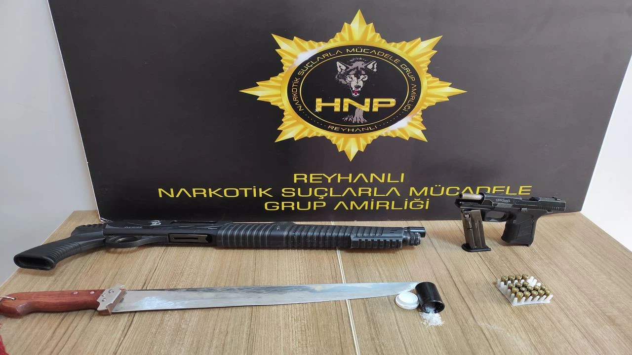Araçta yapılan aramada, ruhsatsız tabanca, şarjör, 17 fişek, ruhsatsız pompalı tüfek, bıçak ve bir miktar sentetik uyuşturucu ele geçirildi.