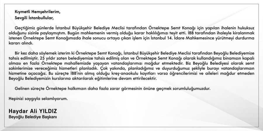 Beyoğlu Belediye Başkanı Haydar Ali Yıldız tarafından yapılan açıklamanın tam metni şu şekilde: