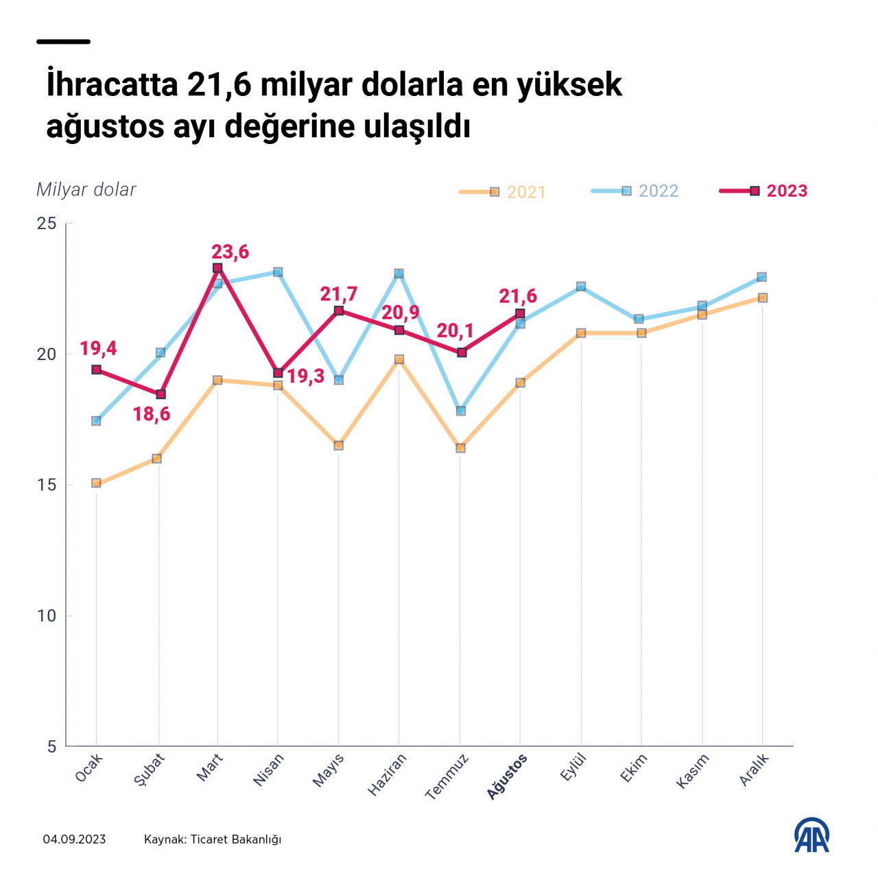Ticaret Bakanlığından ihracat rakamlarına ilişkin yapılan açıklamada da yüzde 1,6 artışla 21 milyar 619 milyon dolar seviyesinde gerçekleşen ağustos ayı ihracatıyla önemli sektörlerde 8 aylık performans gücünün korunduğu aktarılarak, "Ocak-ağustos döneminde ihracatımız 6 Şubat tarihinde ülkemizde yaşanan büyük deprem felaketine rağmen, dünya ekonomisinde durgun bir seyir izleyen üretim ile ticaret hacmine ve ayrıca dünya ticaret fiyatları ile emtia fiyatlarındaki ciddi düşüşe rağmen geçtiğimiz yılki seviyesine yakın 164 milyar 907 milyon dolar olarak gerçekleşmiştir. Ağustos ayı itibarıyla son 12 aylık ihracat ise yüzde 1,2 oranında artış ile 253 milyar 574 milyon dolar olarak gerçekleşmiştir." ifadelerine yer verildi.