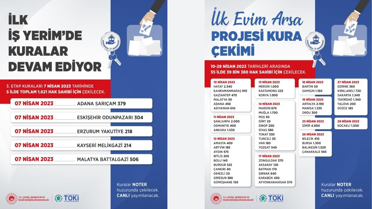 Cumhurbaşkanı Recep Tayyip Erdoğan’ın 13 Eylül 2022 tarihinde açıkladığı ve ilk kuraları 7 Kasım 2022 tarihinde Ardahan ve Şırnak illeriyle başlayan “İlk Evim, İlk İş Yerim” projesinde noter huzurunda gerçekleştirilen kura çekimlerine Kahramanmaraş depremleri sebebiyle ara verilmiş, süreç 6 Mart itibarıyla Ankara ile beraber tekrar başlamıştı. 11 ilde devam eden afet konutlarının inşaları ile eş zamanlı yürütülen kura sürecinde yeni etap başladı. “İlk İş Yerim” projesi üçüncü etap kura çekimleri için 7-28 Nisan tarihleri açıklanırken, “İlk Evim Arsa” kapsamındaki kuralar 10-28 Nisan tarihleri arasında, toplam 39 bin 380 hak sahibi için çekilecek.