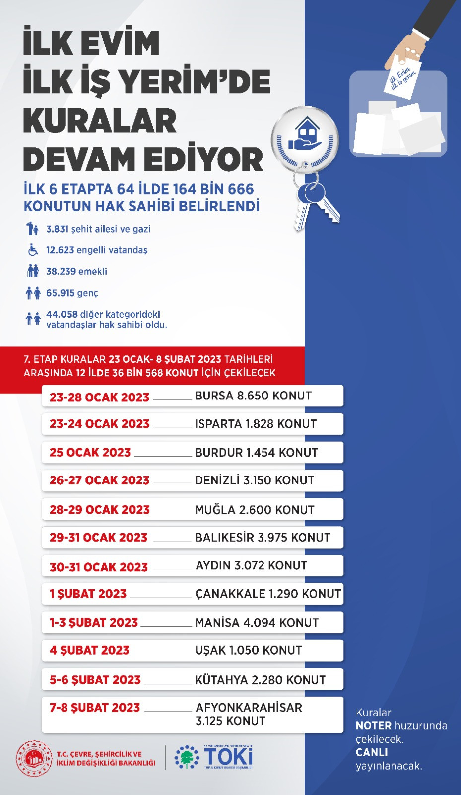 “7’nci etap sosyal konut kura çekilişi 23 Ocak-8 Şubat 2023 tarihleri arasında 12 ilde 36 bin 568 konut için yapılacak”
