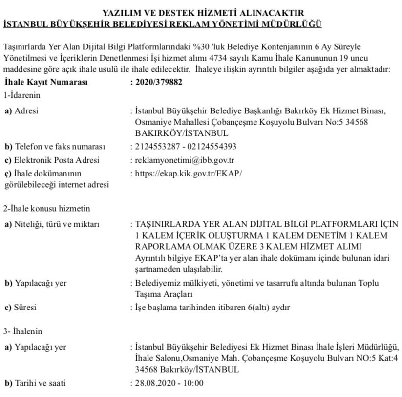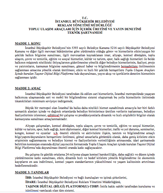 İBB Reklam Yönetimi Müdürlüğü tarafından verilen ihalenin şartnamesinde bir televizyon kanalının ihtiyacı olacak tüm teknik malzeme ve hizmetlerin yer aldığı görüldü.