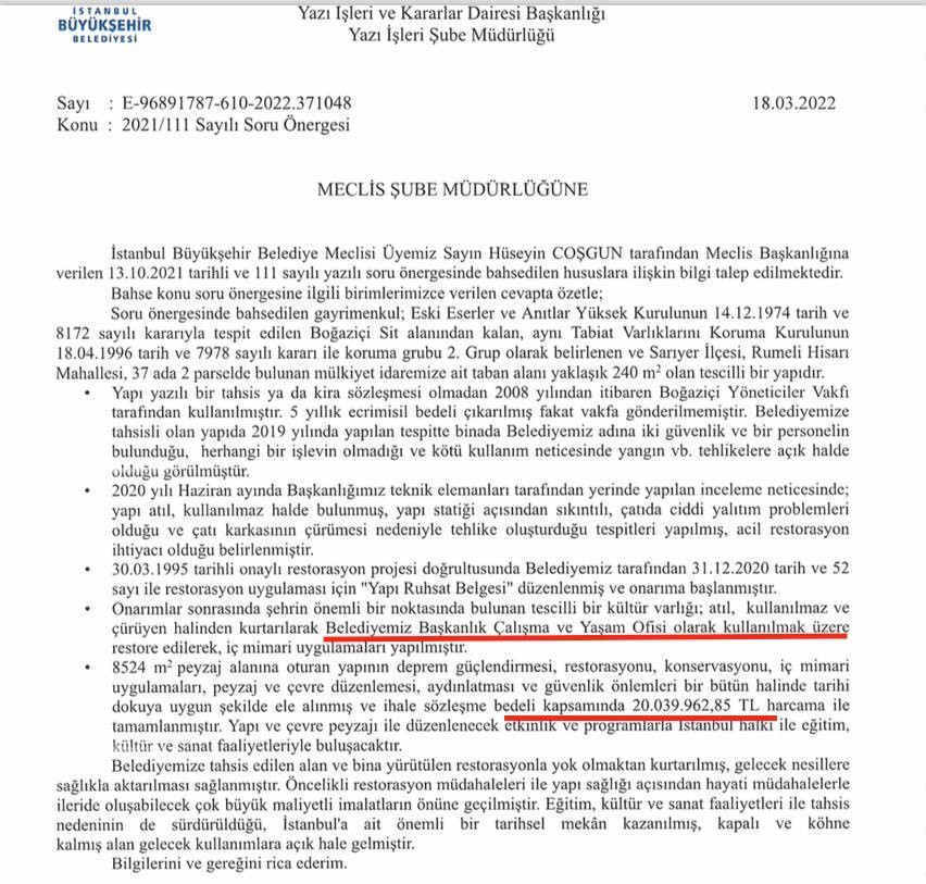 Coşgun’un önergesine başkanlık makamı adına cevap gönderen Yazı İşleri ve Kararlar Daire Başkanlığı köşkün, 20 milyon 39 bin 962 TL’ye restore edildiğini bildirdi.
