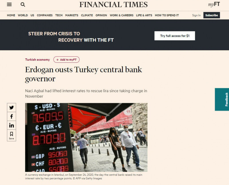 Merkez Bankası Başkanı Naci Ağbal görevinden alınarak yerine Prof. Dr. Şahap Kavcıoğlu atandı. Bu hamleden sonra pazartesi günü piyasaların nasıl bir tepki vereceği, döviz kurunun nasıl hareket edeceği merak ediliyordu. Daha piyasalar açılmadan İngiliz Financial Times ve Guardian gazeteleri Türkiye'ye yapılacak saldırıların sinyalini verdi. Gazeteler yeni Merkez Bankası başkanını hedef aldılar.