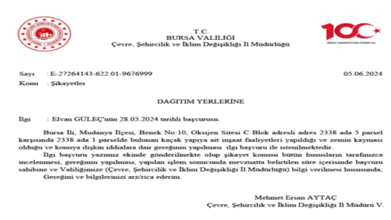Çevre, Şehircilik ve İklim Değişikliği Bakanlığı, konuya ilişkin incelemelerin yapılmasını ve sonucunda mevzuatta belirtilen süre içerisinde taraflara bilgi verilmesini istedi.