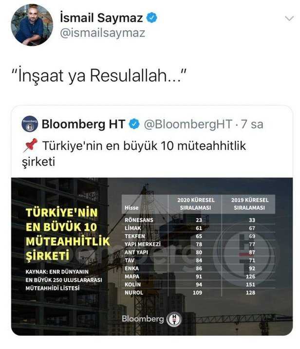 CHP yanlısı haberleriyle bilinen Gazeteci İsmail Saymaz'ın "İnşaat ya Resulallah" başlığıyla sosyal medya platformu Twitter'da yaptığı paylaşım olay yarattı.