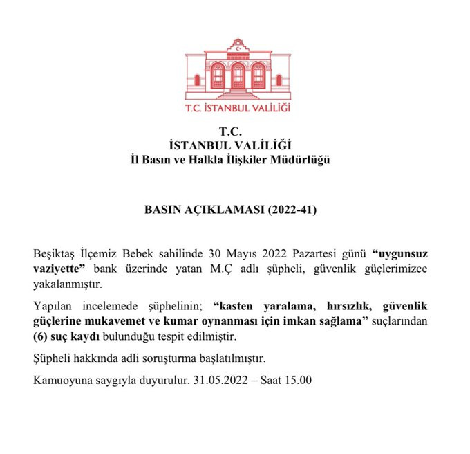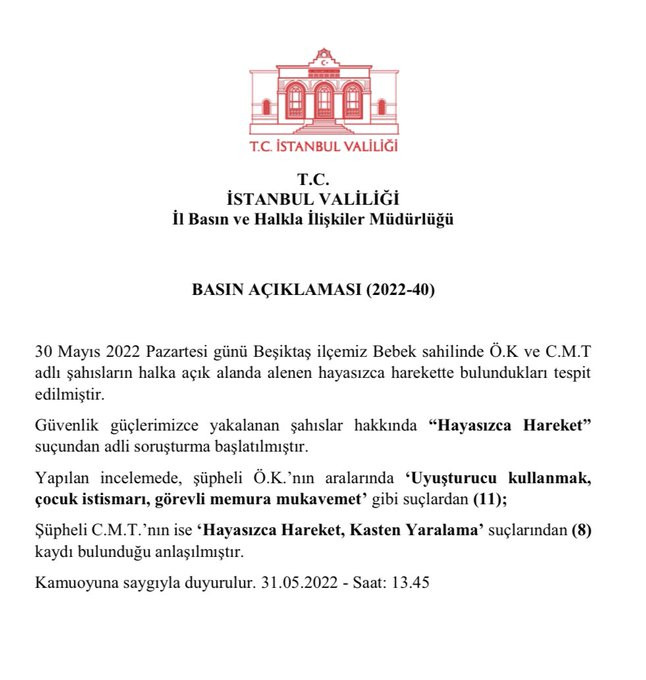 Valilikten yapılan açıklamada, "30 Mayıs 2022 Pazartesi günü Beşiktaş ilçemiz Bebek sahilinde Ö.K ve C.M.T.'nin halka açık alanda alenen hayasızca harekette bulundukları tespit edilmiştir. Güvenlik güçlerimizce yakalanan şahıslar hakkında "Hayasızca Hareket" suçundan adli soruşturma başlatılmıştır. Yapılan incelemede, şüpheli Ö.K.'nın aralarında 'Uyuşturucu kullanmak, çocuk istismarı, görevli memura mukavemet' gibi suçlardan 11, şüpheli C.M.T.'nın ise 'Hayasızca Hareket, Kasten Yaralama' suçlarından 8 kaydı bulunduğu anlaşılmıştır" denildi.