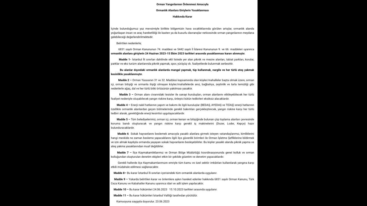 "Belirtilen nedenlerle 6831 sayılı Orman Kanununun 74. maddesi ve 5442 sayılı İl İdaresi Kanununun 9. ve 66. maddeleri uyarınca ormanlık alanlara girişlerin 24 Haziran-15 Ekim arasında yasaklanması kararı alınmıştır. İstanbul İli sınırları dahilinde ekli listede yer alan piknik ve mesire alanları, tabiat parkları, korular, parklar ve eko turizm alanlarında piknik yapmak, spor, yürüyüş ve benzeri faaliyetlerde bulunmak serbesttir. Bu alanlar dışındaki ormanlık alanlarda mangal yapmak, tüp kullanmak, nargile ve her türlü ateş yakmak kesinlikle yasaklanmıştır."