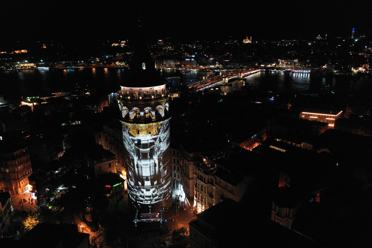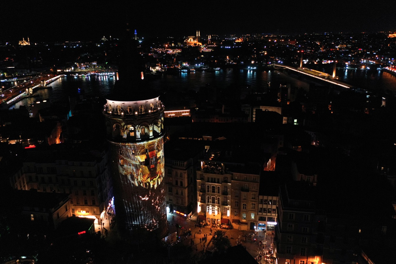 Galata Kulesi'nde Kültür ve Turizm Bakanlığınca organize edilen etkinlikte ise İstanbul'un fethini anlatan görseller ışık ve video mapping yöntemi ile kuleye yansıtıldı.