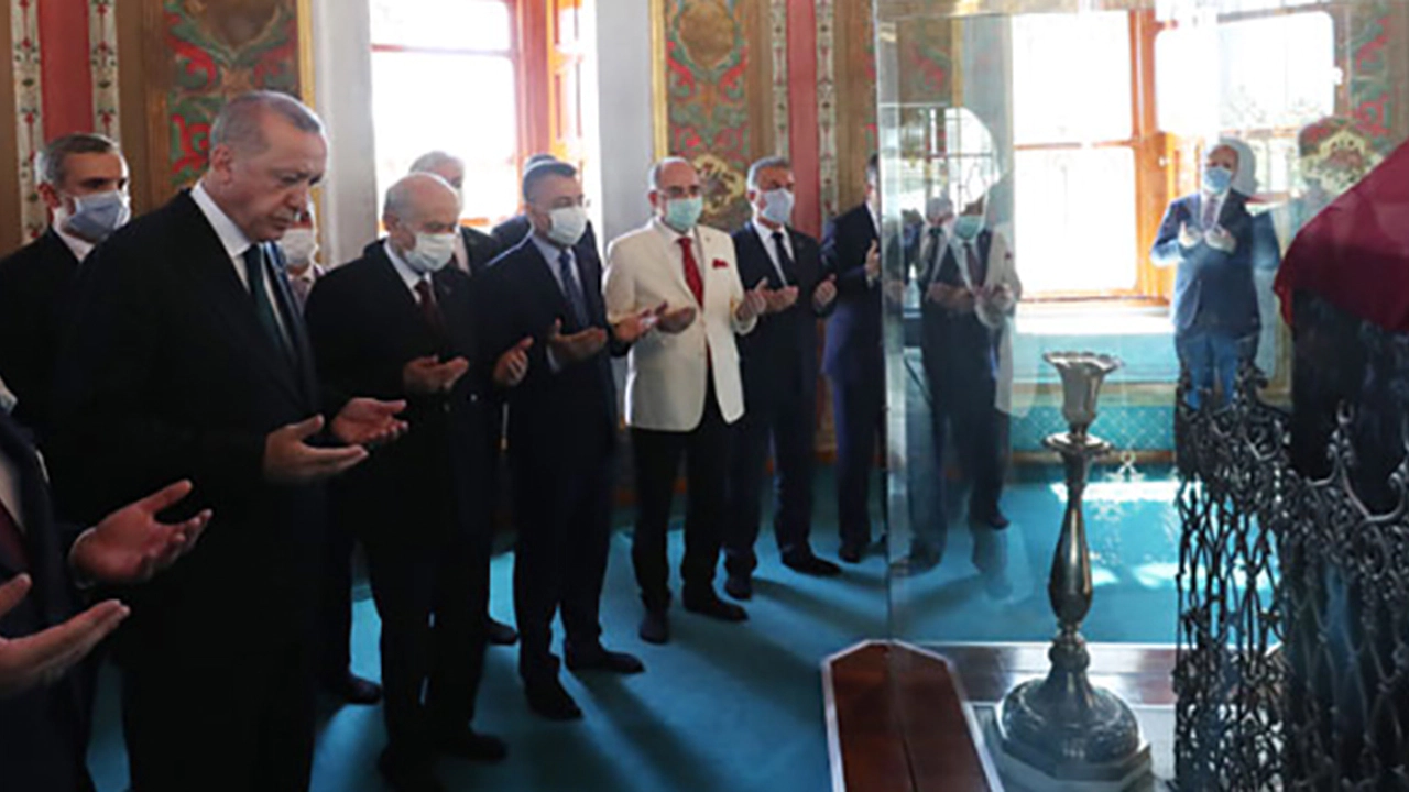 Cumhurbaşkanı Recep Tayyip Erdoğan ve MHP Genel Başkanı Devlet Bahçeli, Fatih Sultan Mehmet Han'ın türbesini ziyaret etti. Cumhurbaşkanı Erdoğan, "Artık burası aslına döndü, camiydi tekrar cami oldu. Şimdi ilanihaye inşallah cami olarak tüm inananlara hizmete devam eder." diyen Erdoğan, "(Ayasofya-i Kebir Cami-i Şerifi) tüm insanlığın bir kültür mirası olarak her dinden insanların gelip gezebileceği bir yer." dedi. Erdoğan, "Ayasofya-i Kebir Cami-i Şerifi'nin açılışışı için 350 bin kişi bugün cuma namazına iştirak etmiş." diye konuştu.