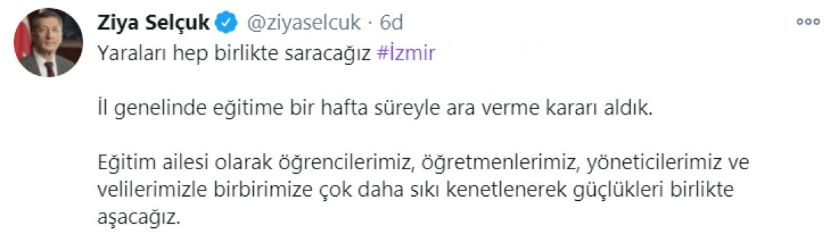 "Yaraları hep birlikte saracağız. İl genelinde eğitime bir hafta süreyle ara verme kararı aldık. Eğitim ailesi olarak öğrencilerimiz, öğretmenlerimiz, yöneticilerimiz ve velilerimizle birbirimize çok daha sıkı kenetlenerek güçlükleri birlikte aşacağız."