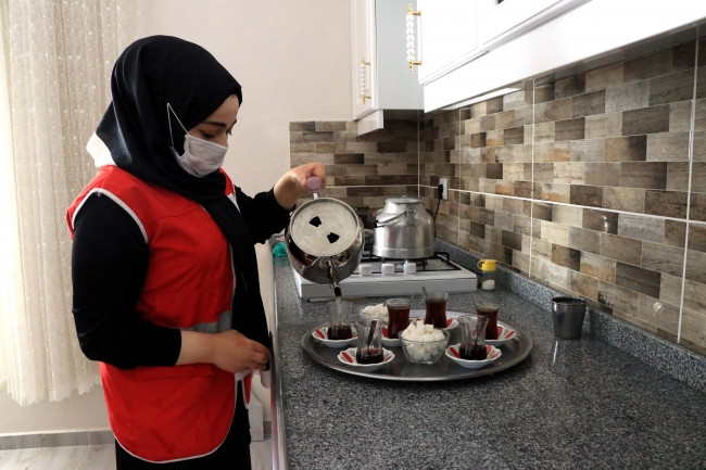 Evdeki işlerini tamamlayan gençler, demledikleri çayı birlikte yudumladıkları yaşlılarla sohbet ediyor.