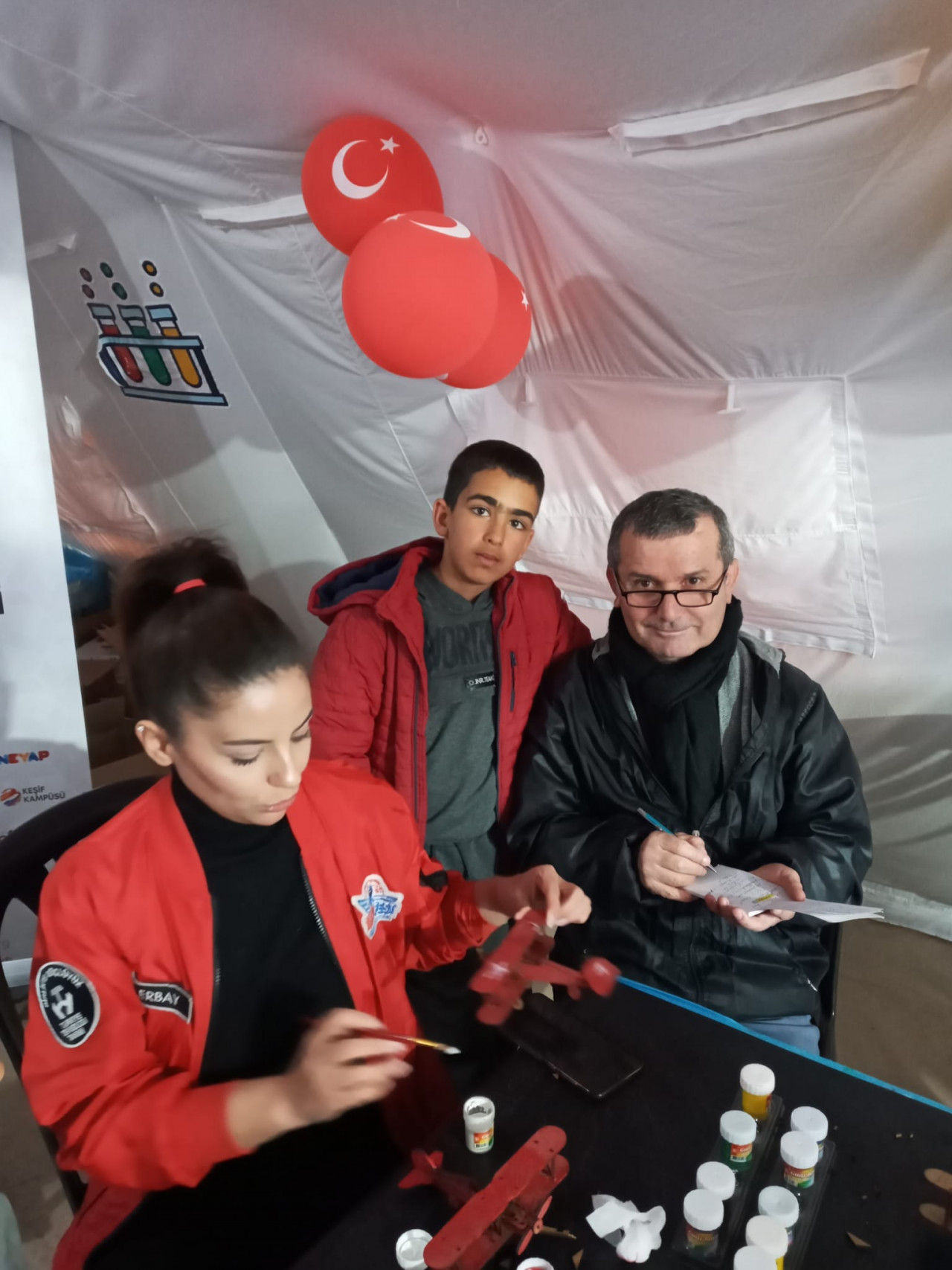 Anlattı: Çadırkentler kurulunca gelmişler bölgeye, çocuklarla maket uçak, helikopter bilgisayar, boyama elektro böcek, çim adam çalışması yapıyorlarmış.