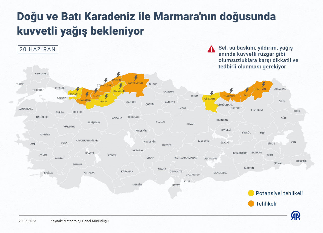 Yapılan son değerlendirmelere göre; sağanak ve gök gürültülü sağanak yağışların Karadeniz (Sinop hariç) Çankırı, Ardahan, Kars çevreleri ile Erzurum'un kuzey kesimlerinde yerel kuvvetli (21-50 kg/m2) Trabzon, Rize, Artvin, Sakarya, Düzce, Zonguldak, Bartın ve Kastamonu’nun kuzeybatısında çok kuvvetli ve şiddetli olması tahmin ediliyor.(51-100 kg/m2) sağanak ve gök gürültülü sağanak yağış beklendiğinden sel, su baskını, yıldırım, yağış anında kuvvetli rüzgar gibi olumsuzluklara karşı dikkatli ve tedbirli olunması gerekmektedir.