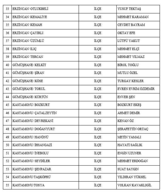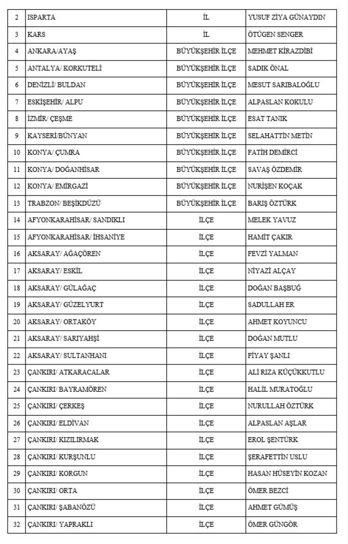 MHP'den yapılan açıklamada, "Partimizin yetkili kurullarının yapmış olduğu değerlendirme ve Genel Başkanımız Sayın Devlet Bahçeli’nin onayları sonucunda 31 Mart 2024 Mahalli İdareler Seçimleri'nde 3. etap olarak adaylıkları kesinleşen 3 il, 10 Büyükşehir İlçe, 42 İlçe Belediye Başkan Adayımız olmak üzere toplam 55 adayımızın isim listesi aşağıdadır" denildi.