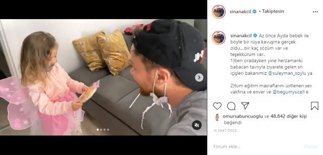 O sırada evde bulunan ünlü şarkıcı Sinan Akçıl, o anları sosyal medya hesabında paylaştı. Bakan Soylu ve ünlü şarkıcı, oyuncaklar hediye ettikleri Ayda ile bir süre oyun oynayarak minik kızı sevdi. Ayda'ya birçok hediye ve kıyafet götüren Akçıl, Instagram'dan duygusal bir paylaşım yaparak şunları söyledi: "Az önce Ayda bebek ile böyle bir rüya kavuşma gerçek oldu.... Bir kaç sözüm var ve teşekkürüm var...