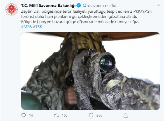 Bakanlığın Twitter hesabından yapılan açıklamada, "Zeytin Dalı bölgesinde terör faaliyeti yürüttüğü tespit edilen 2 PKK/YPG'li terörist daha hain planlarını gerçekleştiremeden gözaltına alındı. Bölgede barış ve huzura gölge düşmesine müsaade etmeyeceğiz" denildi.