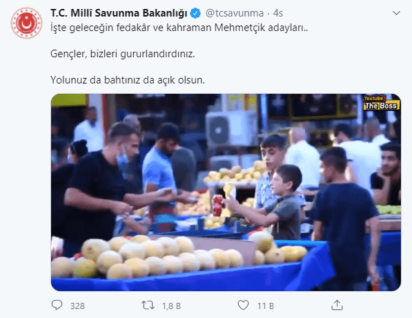 Milli Savunma Bakanlığı'nın Twitter'daki hesabından, Diyarbakır'da sosyal medya fenomenleri Mert Karakaş ile Burak Tutal'ın yaptığı sosyal deneyde 'Param yok, açım. Bana yemek alabilir misin?' sorularına verdikleri cevaplar ve yardımseverlikleri ile takdir toplayan çocukların videosu paylaşıldı.