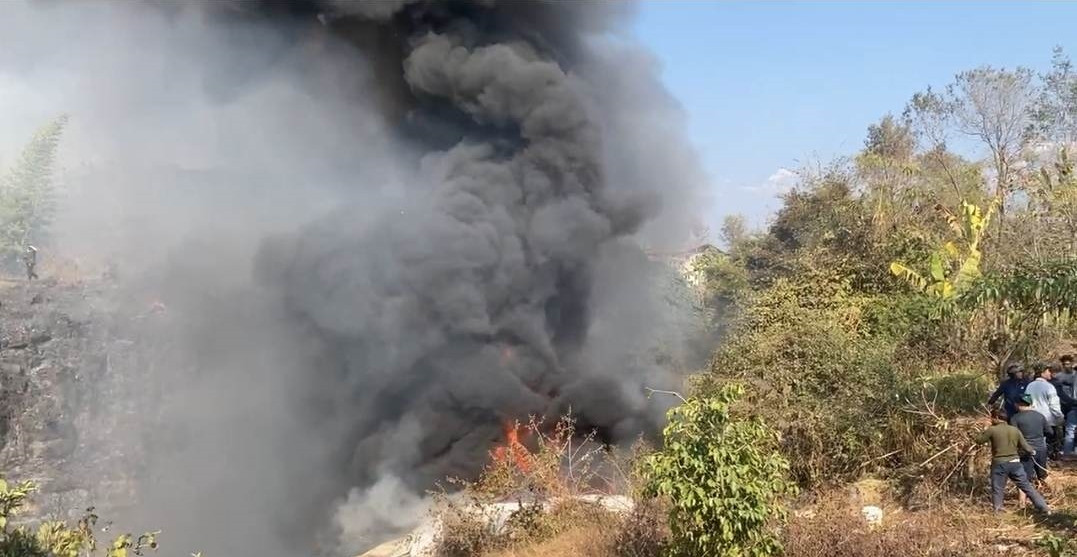 Devlet televizyonun yayınladığı görüntülerde, Himalaya Dağları'nın eteğindeki sarp bölgede düşen uçaktan alev ve dumanların çıkması yer aldı.