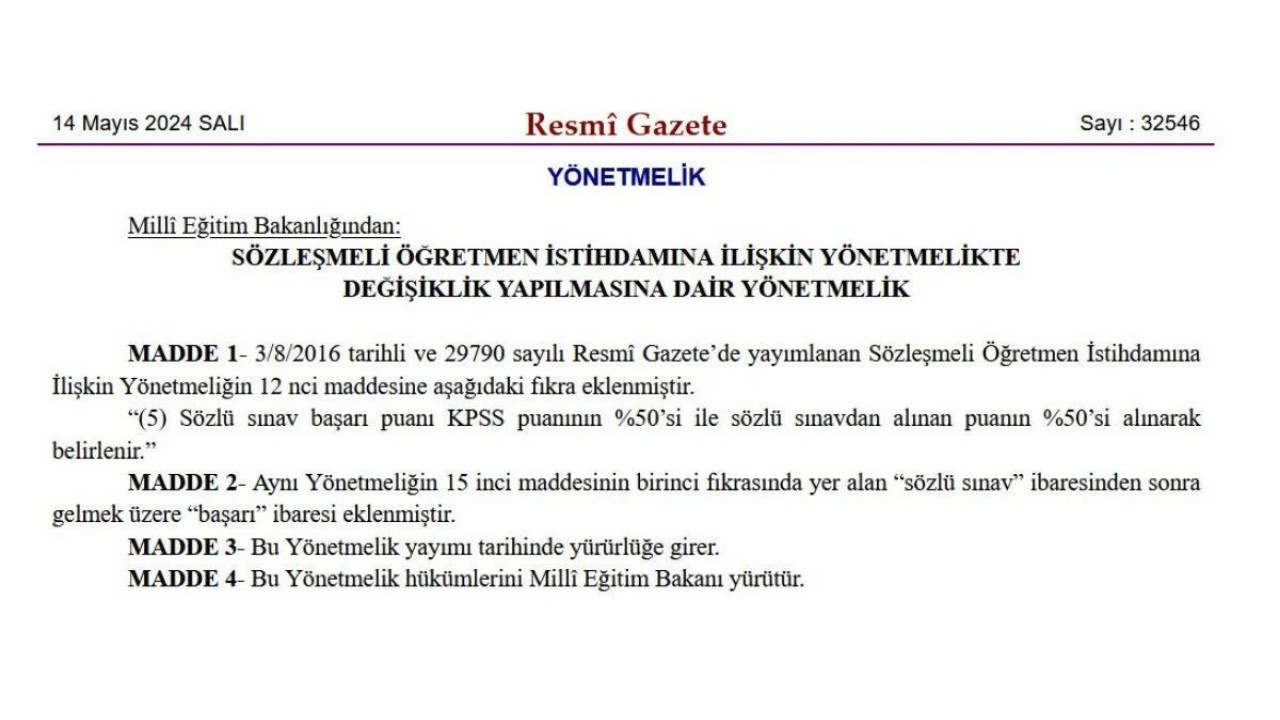 Yönetmeliğe göre, sözleşmeli öğretmen istihdamında mülakat puanının Kamu Personeli Seçme Sınavı (KPSS) puanının yüzde 50’si ile sözlü sınavdan alınan puanın yüzde 50’si alınarak belirlenmesine karar verildi.