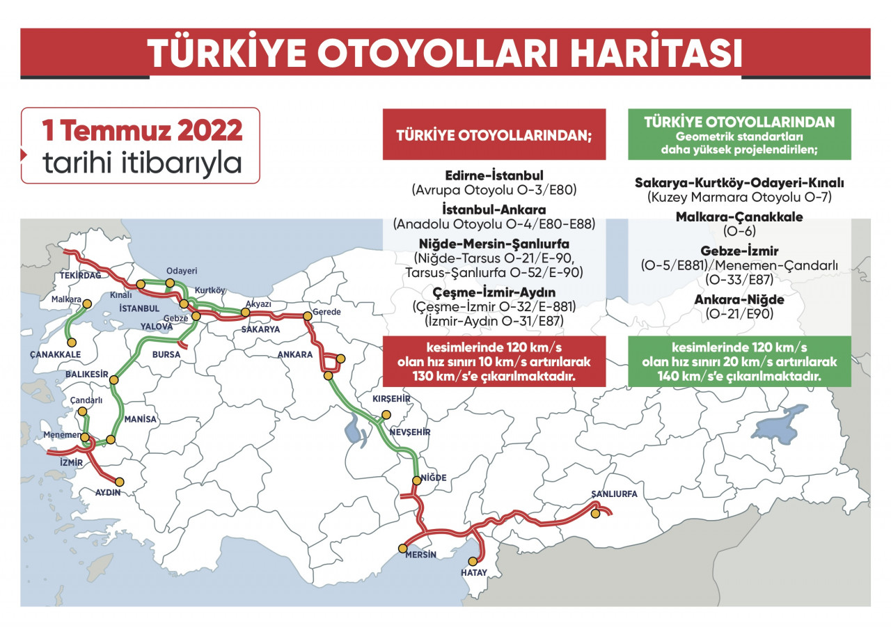Edirne-İstanbul, İstanbul-Ankara, Niğde-Mersin-Şanlıurfa Tarsus-Şanlıurfa, Çeşme-İzmir-Aydın otoyollarındaki 120 kilometre/saat olan hız sınırı 10 kilometre/saat artırılarak 130 kilometre/saate, Kuzey Marmara otoyolunun Sakarya-Kurtköy-Odayeri-Kınalı bölümü ile Malkara-Çanakkale, Gebze-İzmir, Menemen-Çandarlı, Ankara-Niğde otoyollarında ise 120 kilometre/saat olan hız sınırı 20 kilometre/saat artırılarak 140 kilometre/saate çıkarılacak.