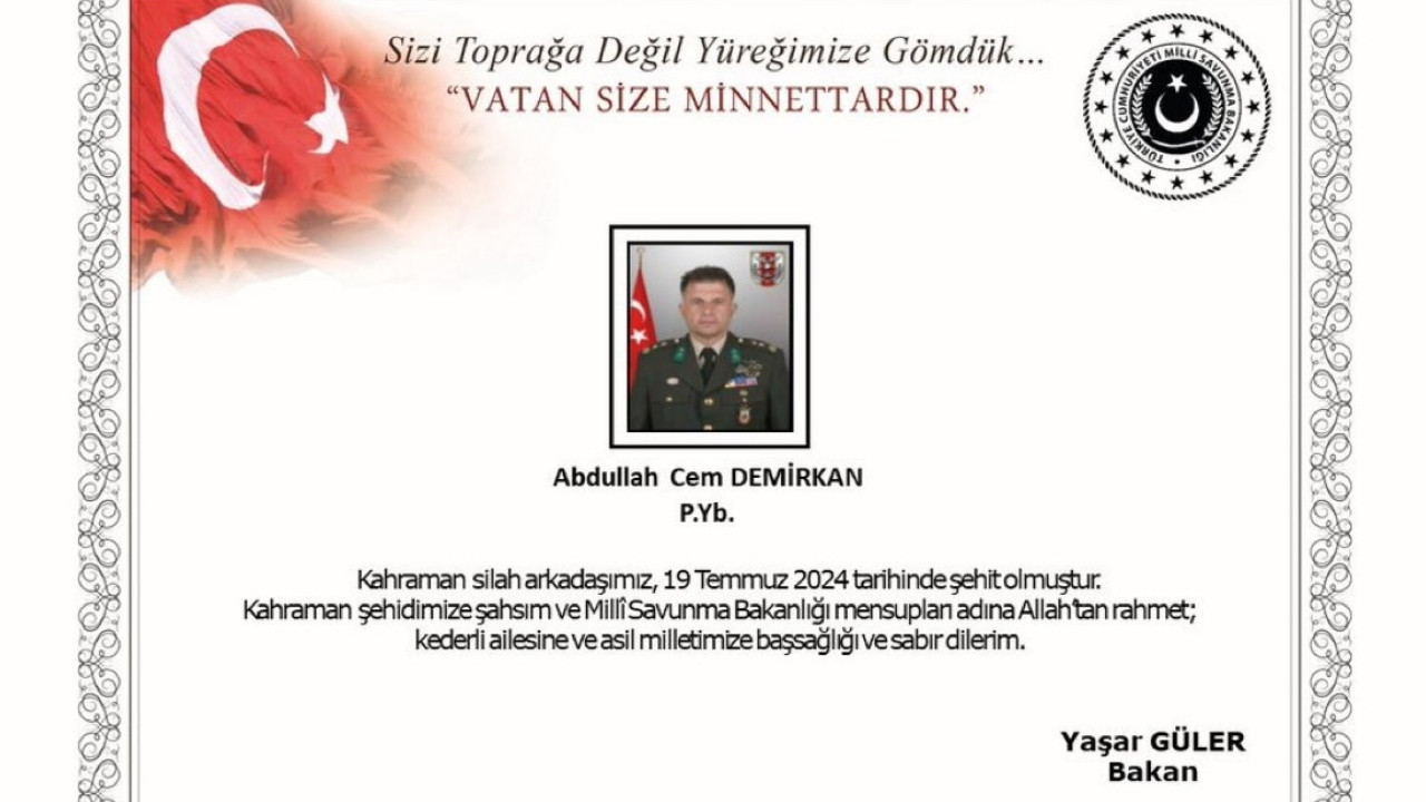 Milli Savunma Bakanı Yaşar Güler de Piyade Yarbay Demirkan için paylaştığı taziye mesajında, "Kahraman şehidimize şahsım ve Milli Savunma Bakanlığı mensupları adına Allah'tan rahmet, kederli ailesine ve asil milletimize başsağlığı ve sabır dilerim." ifadesine yer verdi.