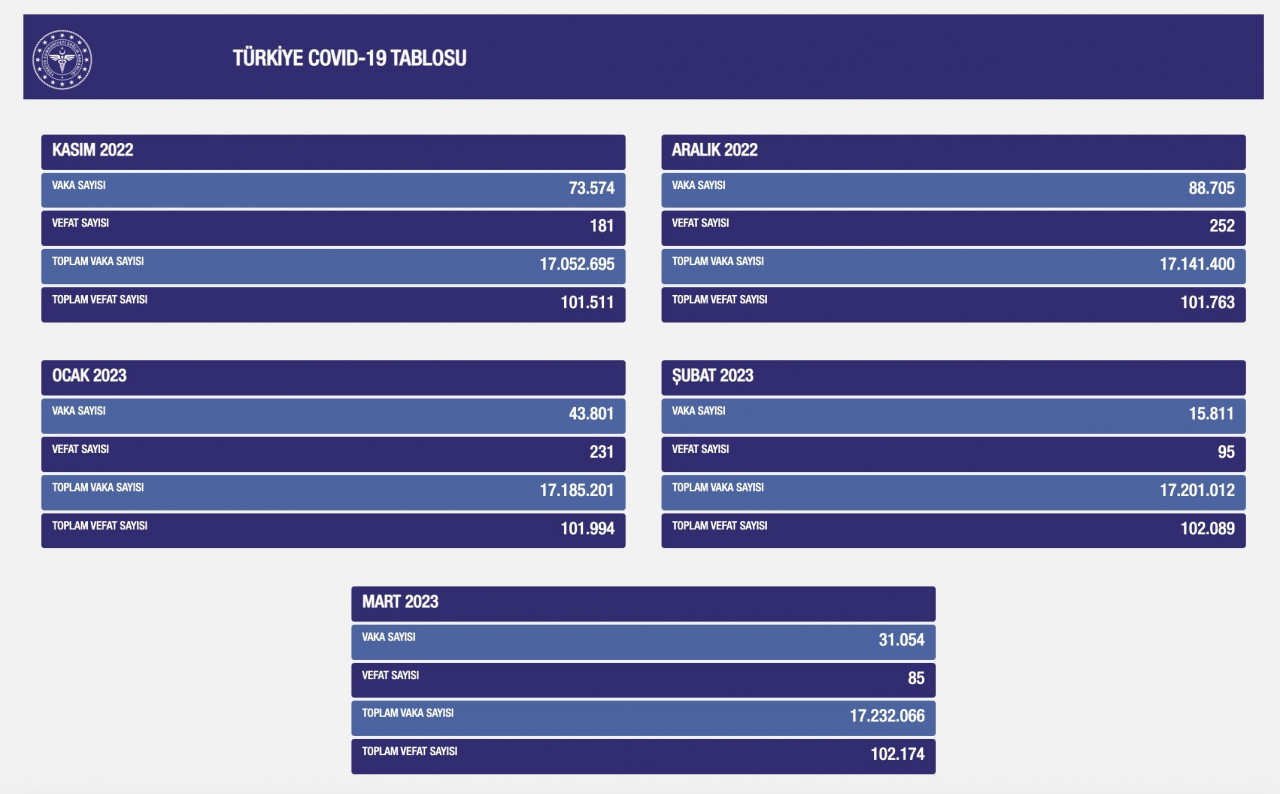 Sağlık Bakanlığı geçtiğimiz yıl Kasım ayı ile Mart 2023 tarihleri arasındaki Covid-19 verilerini açıkladı. Sınırlı test sayılarına rağmen beş ayda 179 bin 371 yeni vaka kaydedilirken ölüm sayısı ise 844 oldu.