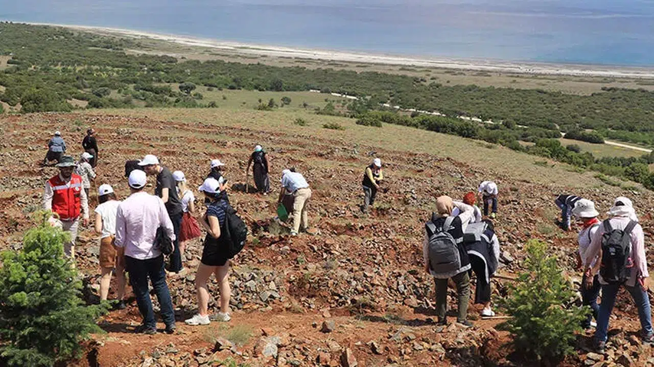 Daha sonra Salda Gölü'nü tepeden gören Doğanbaba köyünün yamaçlarında fidanlar toprakla buluşturuldu. İTÜ maden Fakültesi Jeoloji Müjendisliği Bölümü öğretim üyesi Prof. Dr. Nurgül Çelik Balcı da Salda Gölü'nün yapısı hakkında katılımcılara bilgi verdi.