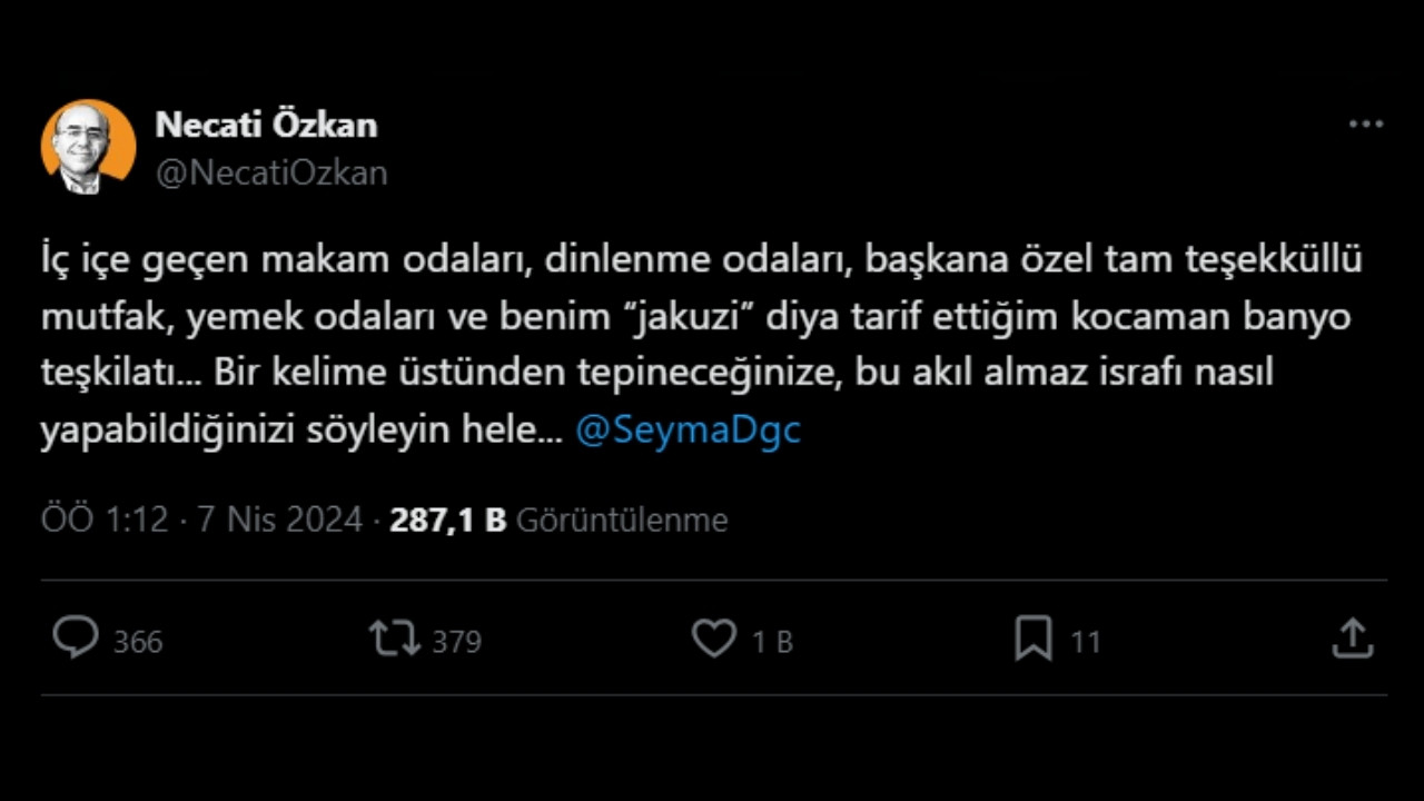 İç içe geçen makam odaları, dinlenme odaları, başkana özel tam teşekküllü mutfak, yemek odaları ve benim “jakuzi” diya tarif ettiğim kocaman banyo teşkilatı... Bir kelime üstünden tepineceğinize, bu akıl almaz israfı nasıl yapabildiğinizi söyleyin hele... @SeymaDgc