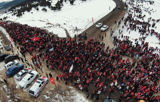 Ellerinde Türk bayrakları bulunan binlerce kişi, burada Kur'an-ı Kerim okuyup tekbir ve salavatlar getirerek şehitler için dua ettikten sonra soğuk havada Ay-Yıldızlı Tören Alanı'na doğru yürüyüşe geçti.