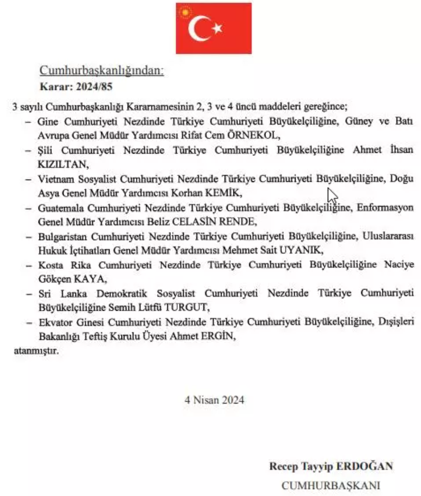 Gine Cumhuriyeti Büyükelçiliğine, Güney ve Batı Avrupa Genel Müdür Yardımcısı Rifat Cem Örnekol, Şili Cumhuriyeti Büyükelçiliğine Ahmet İhsan Kızıltan, Vietnam Sosyalist Cumhuriyeti Büyükelçiliğine, Doğu Asya Genel Müdür Yardımcısı Korhan Kemik, Guatemala Cumhuriyeti Büyükelçiliğine, Enformasyon Genel Müdür Yardımcısı Beliz Celasin Rende, Bulgaristan Cumhuriyeti Büyükelçiliğine, Uluslararası Hukuk İçtihatları Genel Müdür Yardımcısı Mehmet Saik Uyanık, Kosta Rika Cumhuriyeti Büyükelçiliğine Naciye Gökçen Kaya, Sri Lanka Demokratik Sosyalist Cumhuriyeti Büyükelçiliğine Semih Lütfu Turgut, Ekvator Ginesi Cumhuriyeti Büyükelçiliğine Dışişleri Bakanlığı Teftiş Kurulu Üyesi Ahmet Ergin atandı.