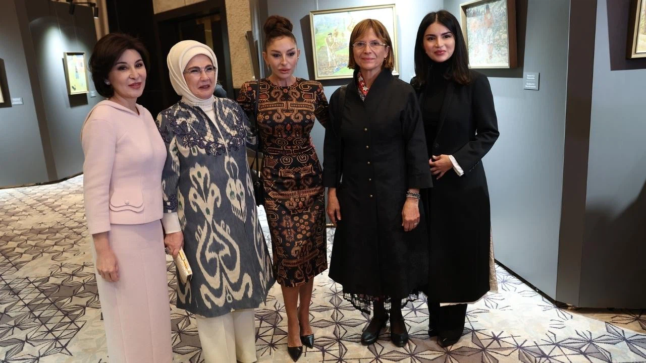 First ladyler, Ebedi Şehir ziyaretinin ardından Semerkant'ta Expo Fuar Alanı'nda düzenlenen ve Özbekistan tarihini anlatan "Sonsuz Seraplar" sergisini gezdi.