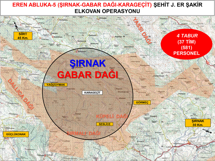 Bakanlıktan yapılan açıklamada, terör örgütü PKK'yı ülke gündeminden çıkarmak ve bölgede barındığı değerlendirilen teröristleri etkisiz hale getirmek amacıyla başlatılan "Eren Abluka-5 (Şırnak-Gabar Dağı-Karageçit) Şehit Jandarma Er Şakir Elkovan" Operasyonu'nda, Çakırsöğüt Jandarma Komando Tugay Komutanlığınca, jandarma özel harekat, jandarma komando ve güvenlik korucusundan oluşan 581 personel, 37 operasyonel timin görev aldığı belirtildi.