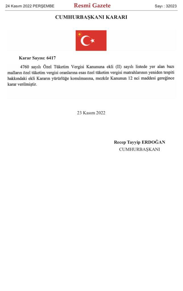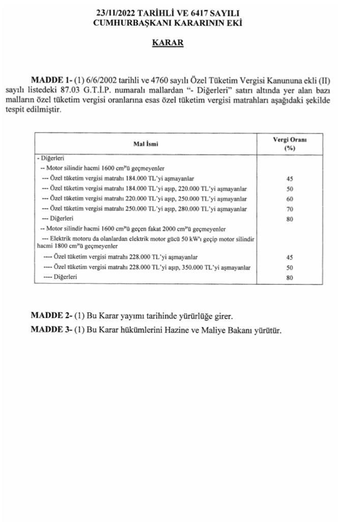 "4760 sayılı Özel Tüketim Vergisi Kanununa ekli (II) sayılı listede yer alan bazı malların Özel tüketim vergisi oranlarına esas özel tüketim vergisi matrahlarının yeniden tespiti hakkındaki ekli Kararın yürürlüğe konulmasına, mezkûr Kanunun 12 nci maddesi gereğince karar verilmiştir." denilerek yeni matrah güncellemesi paylaşıldı.